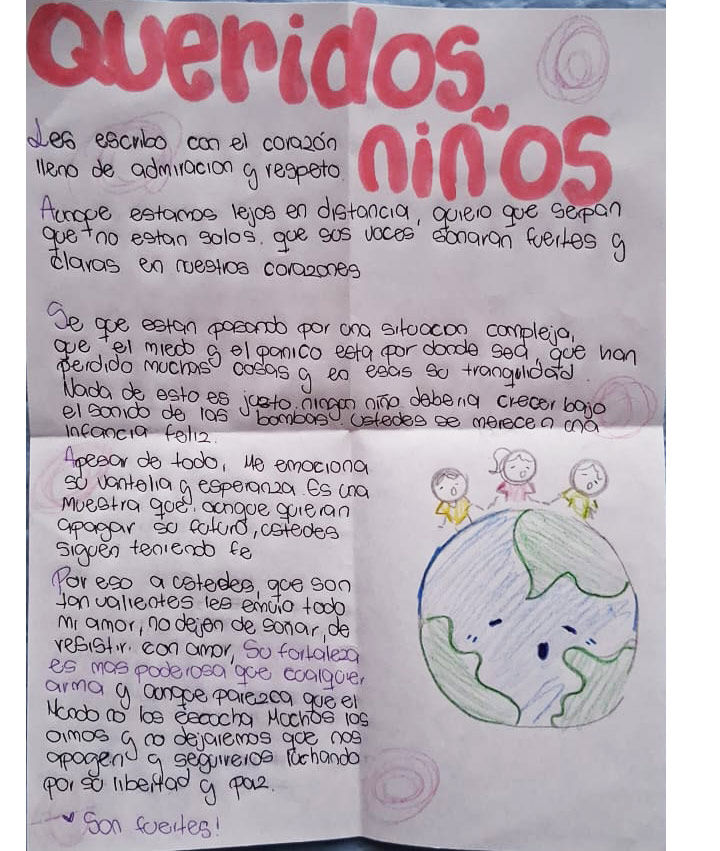 Esta dinámica busca que cada carta sea un puente: un gesto de amistad, empatía y solidaridad entre quienes sueñan con un planeta donde nadie sufra por la guerra y todos puedan vivir con respeto y alegría.